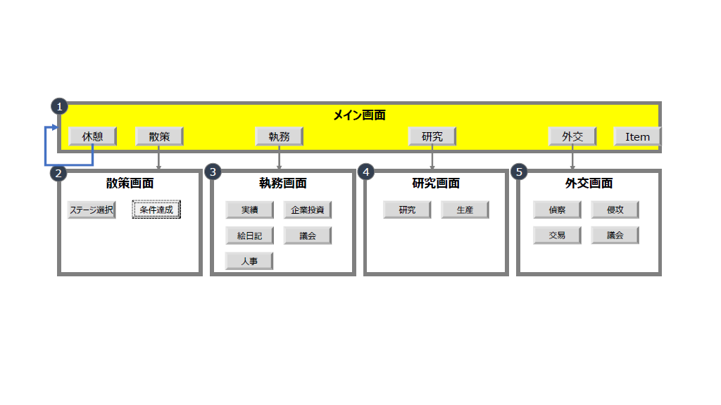 以上、つらつらと記載してきましたが、これらが主に内政的な画面です。